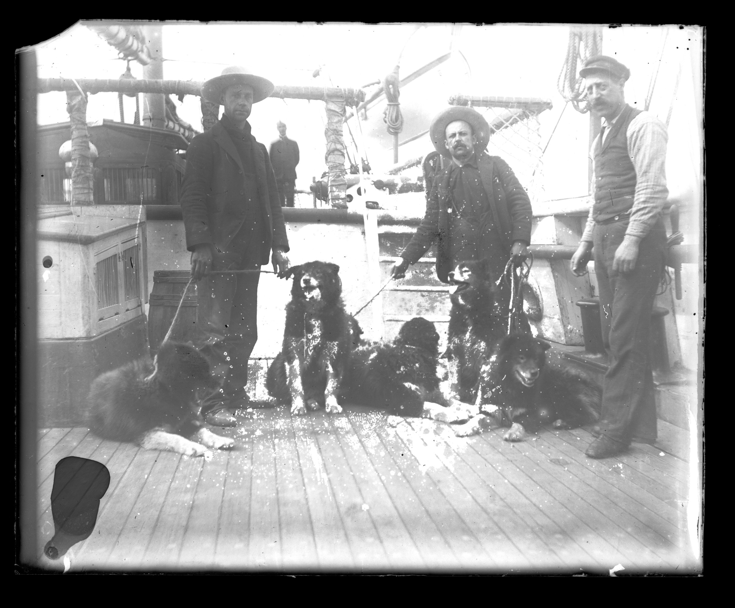 E.A. Hegg [Native men in kayaks or umiaks pulled up alongside large ship]