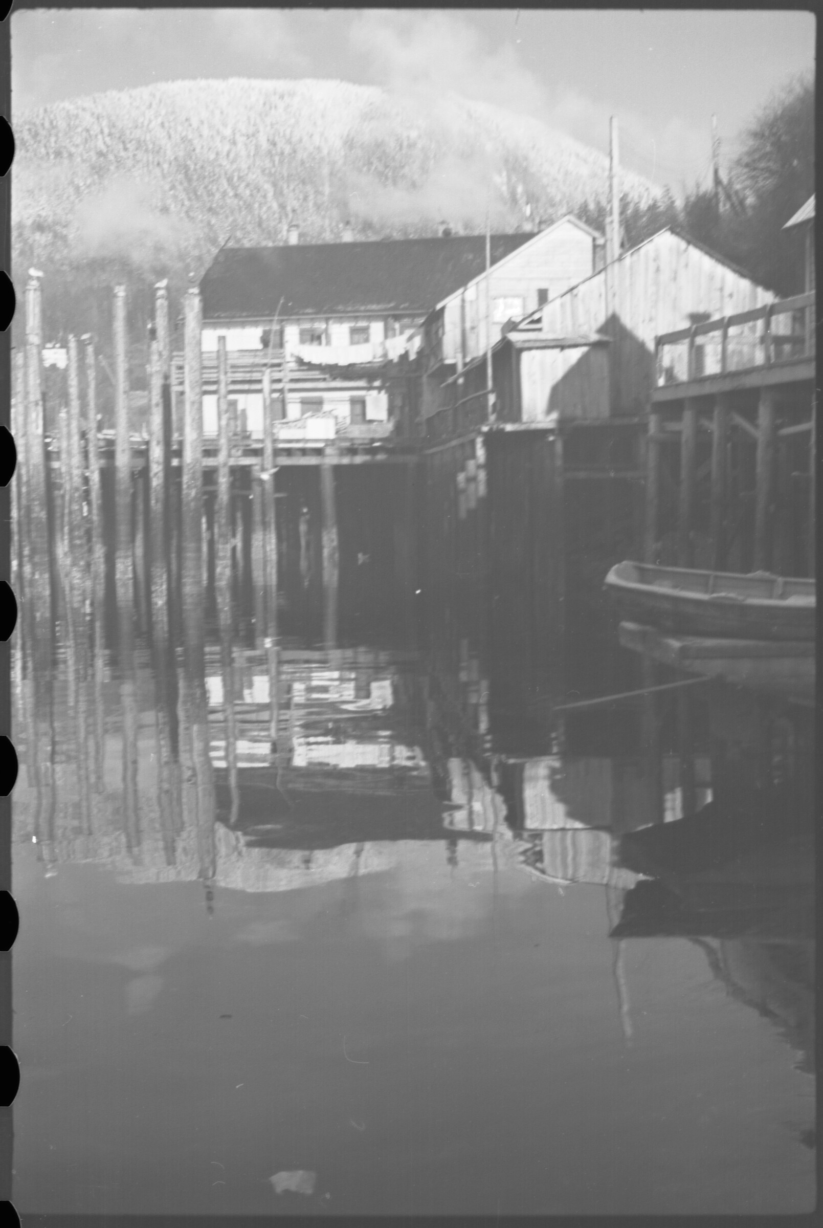 60-2 views taken around Thomas Basin; Basha's [January 1941, Ketchikan; waterfront structures built on pilings; reflection; seagulls atop pilings; boat at right; mountain in distance]