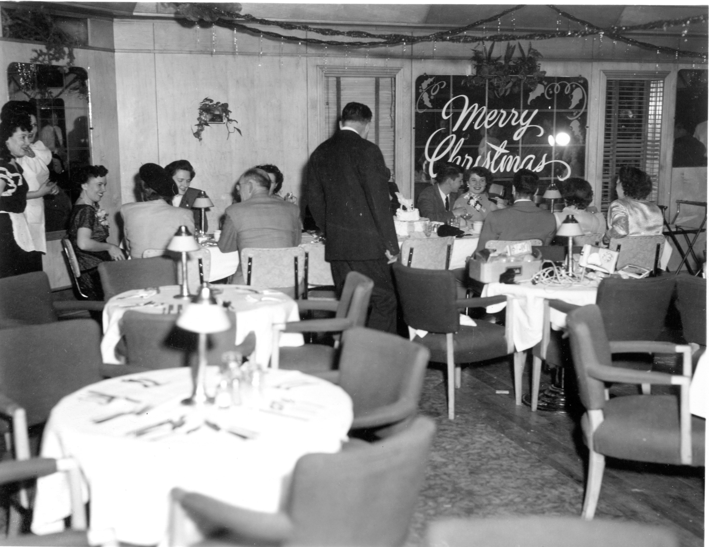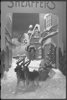 57-2; Christmas card negatives; 90 mm [December 1940; snowy street scene artwork includes Santa, sleigh, and reindeer with tag "Greetings, Basha and Ken;" "Sheaffers" at top of image]