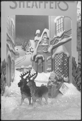 57-1; Dec. 1940; Pan X, Dev 14 min @ 7o° DK 20; Christmas card negatives; 90 mm [snowy street scene artwork includes Santa with gift and tag "Greetings, Basha and Ken," "Sheaffers" at top of image]