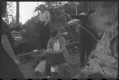13-3 gang around Jennings campfire [four women near smoke, one holding large stick; likely 1939]
