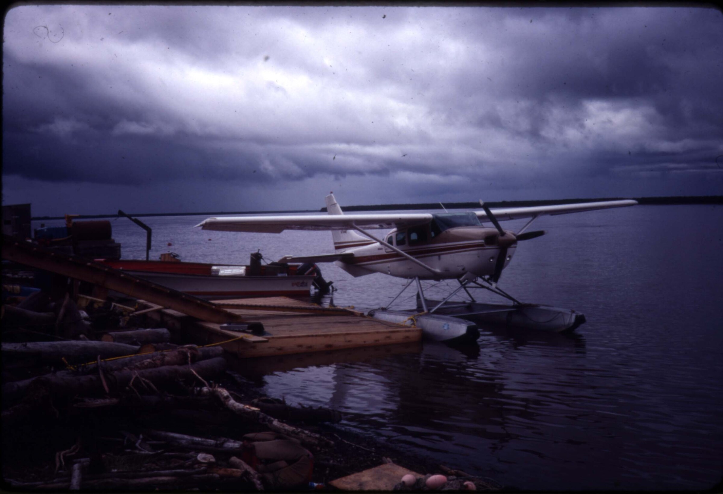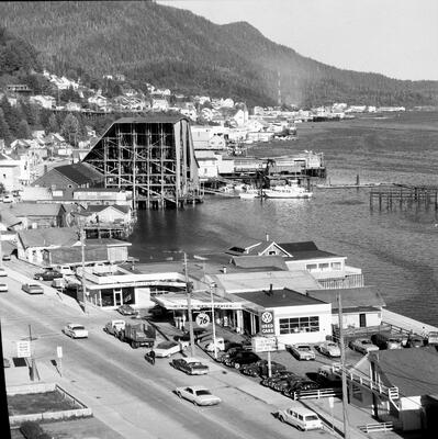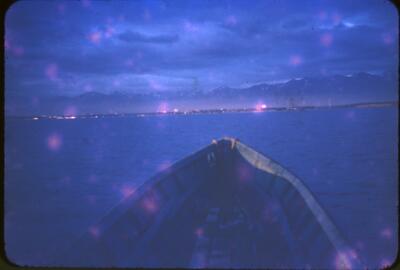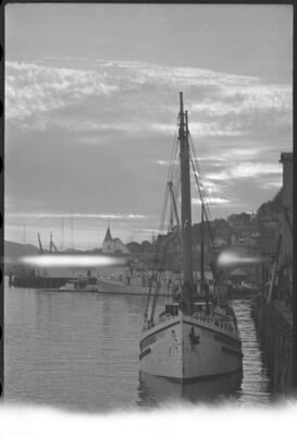 19-3 July 13, 9 p.m. using 105 mm lens - 6.3 c 1/20; boat & sunset [SEYMOUR at dock in foreground; boats, structures in background; Ketchikan, 1939]