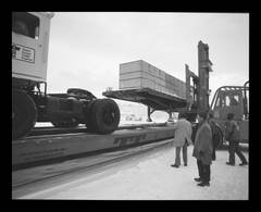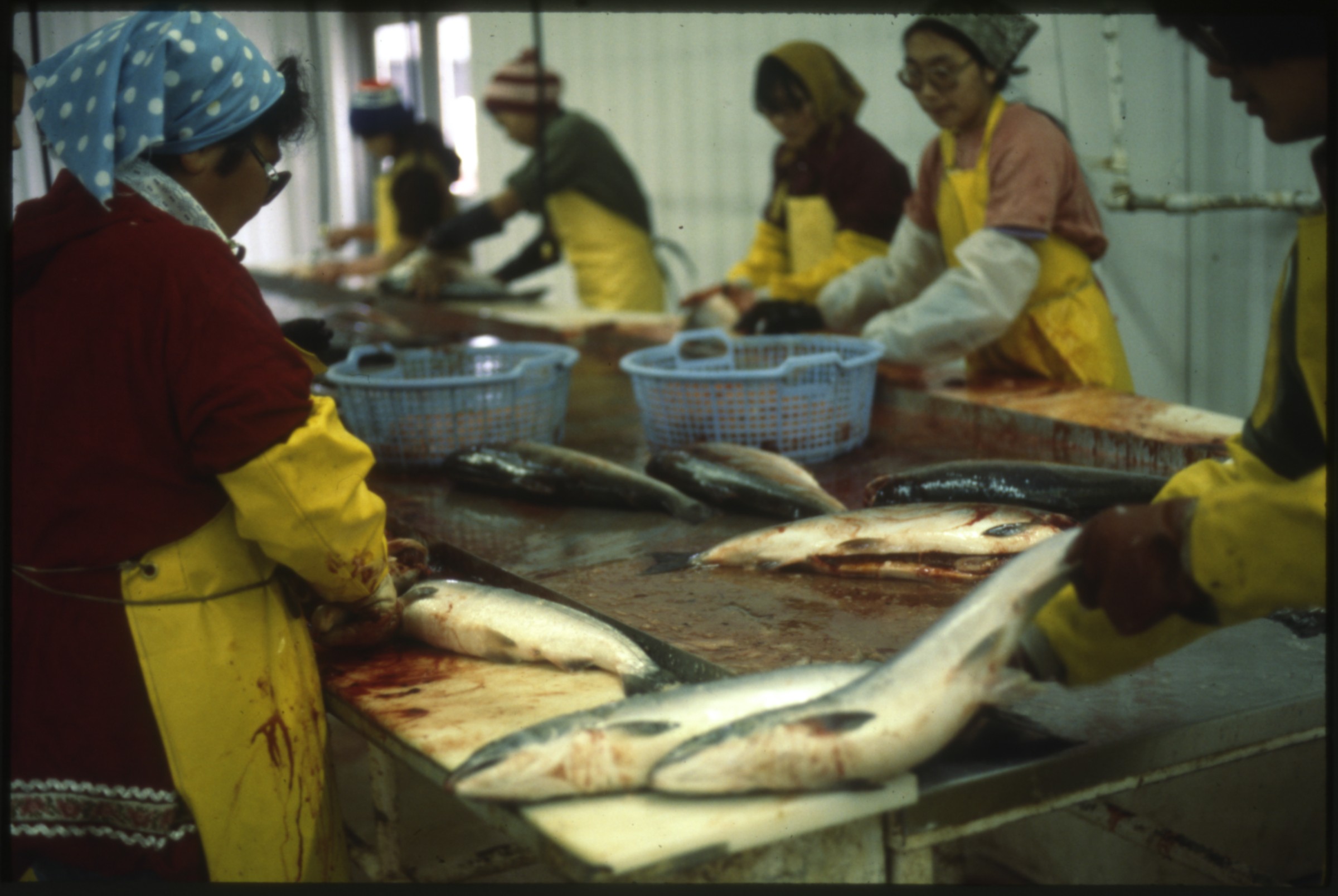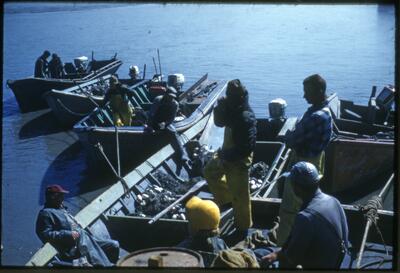 26-2 Fish dock scene [three men working at dock, salmon fishing, totes; ice; likely Ketchikan, 1939]