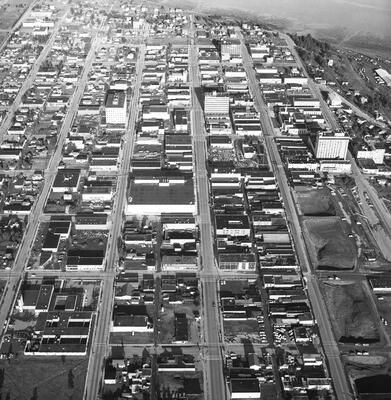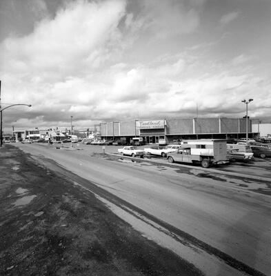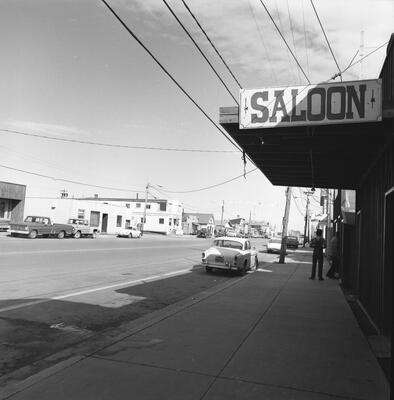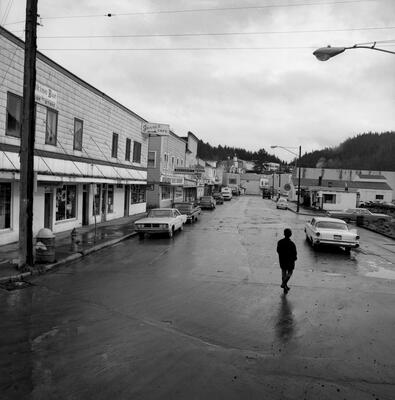 T115 Main Street, Wrangell, Alaska; Frank Morgan photo [street scene with dirt street, possibly wooden siidewalks; people on sidewalks; automobiles; totem poles; businesses: The Wrangell Sentinel, Bear Totem Store, Curios, Drugs; copy neg]