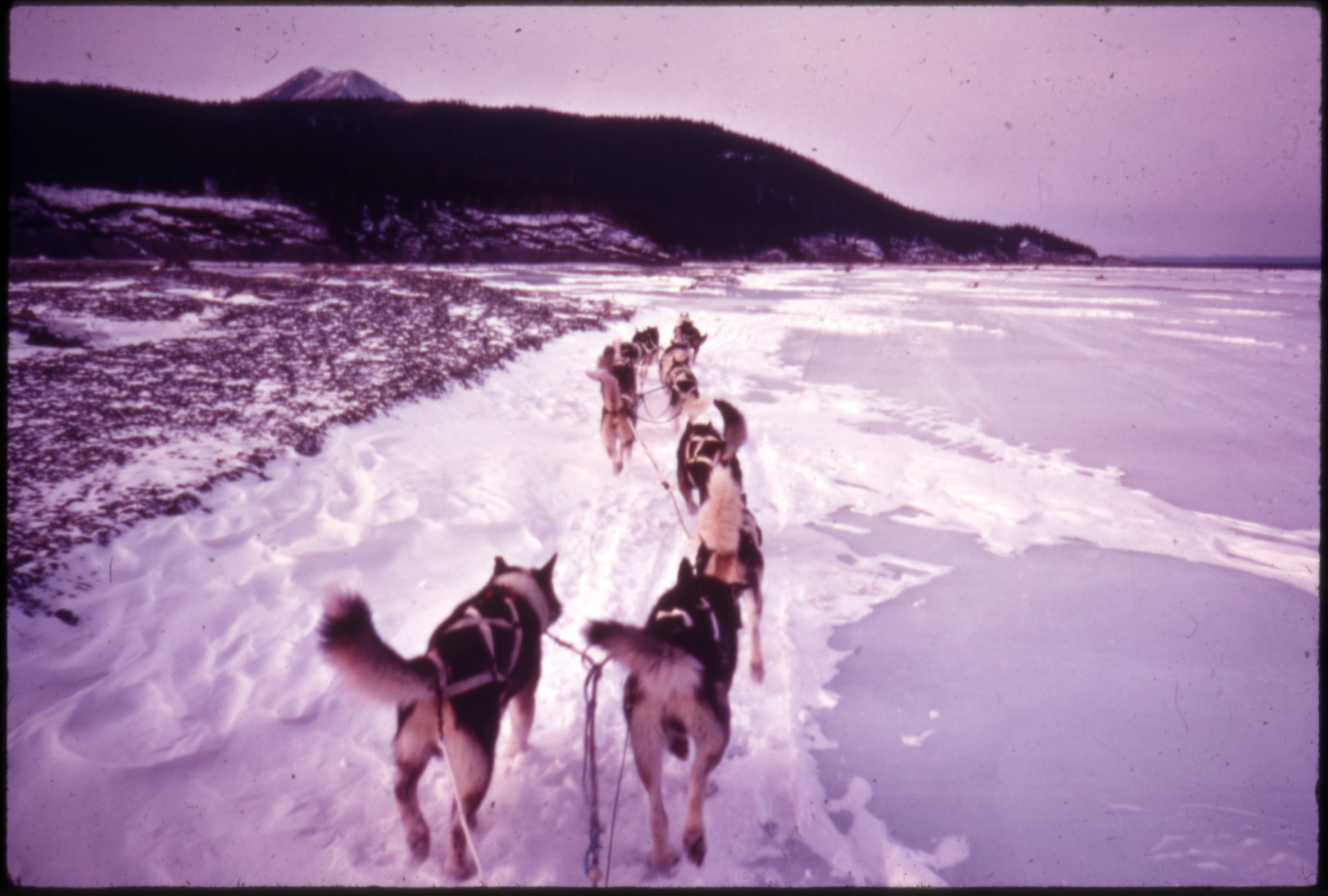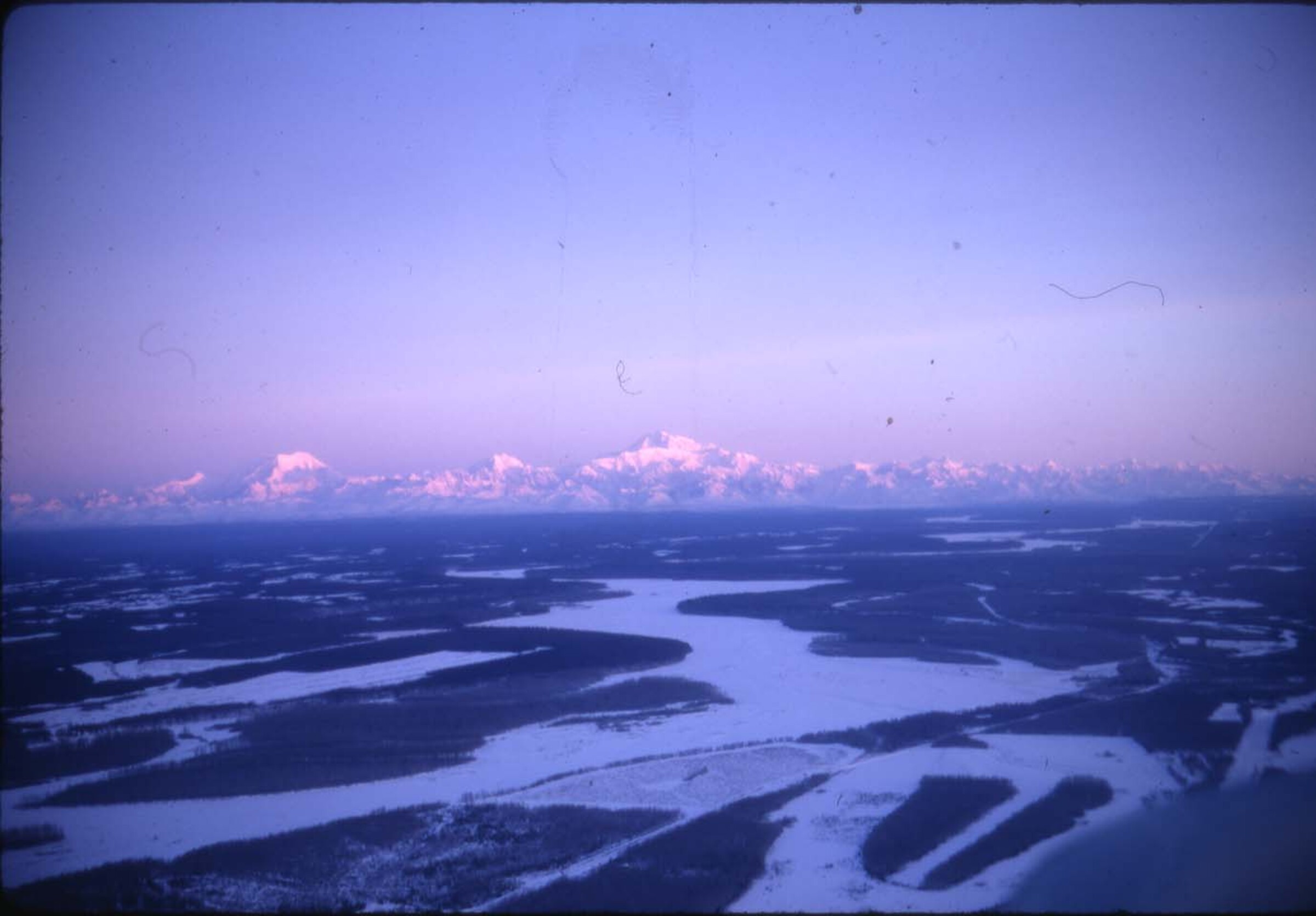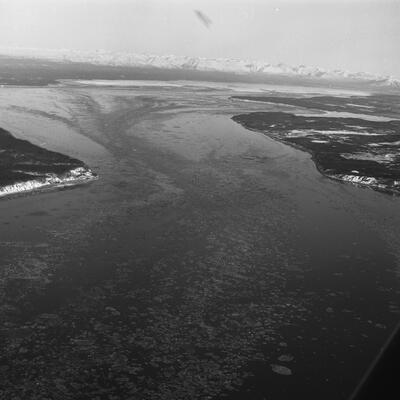 (Ship Creek, Post Road Feb 1958)[ Ship Creek in winter with ice coverage, flowing away from the Chugach Mtns]