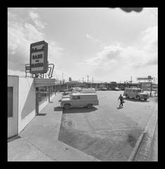 City Hall, Anchorage, Alaska. Hewitt's Foto [1940s Fourth Avenue street scene looking southeast, with pedestrians, automobiles, truck, O'Harra Bus Lines bus, and large scale or thermometer on City Hall Lawn. cf .1375. Similar image in Hamilton Collection, B1976.082.29. copy neg]