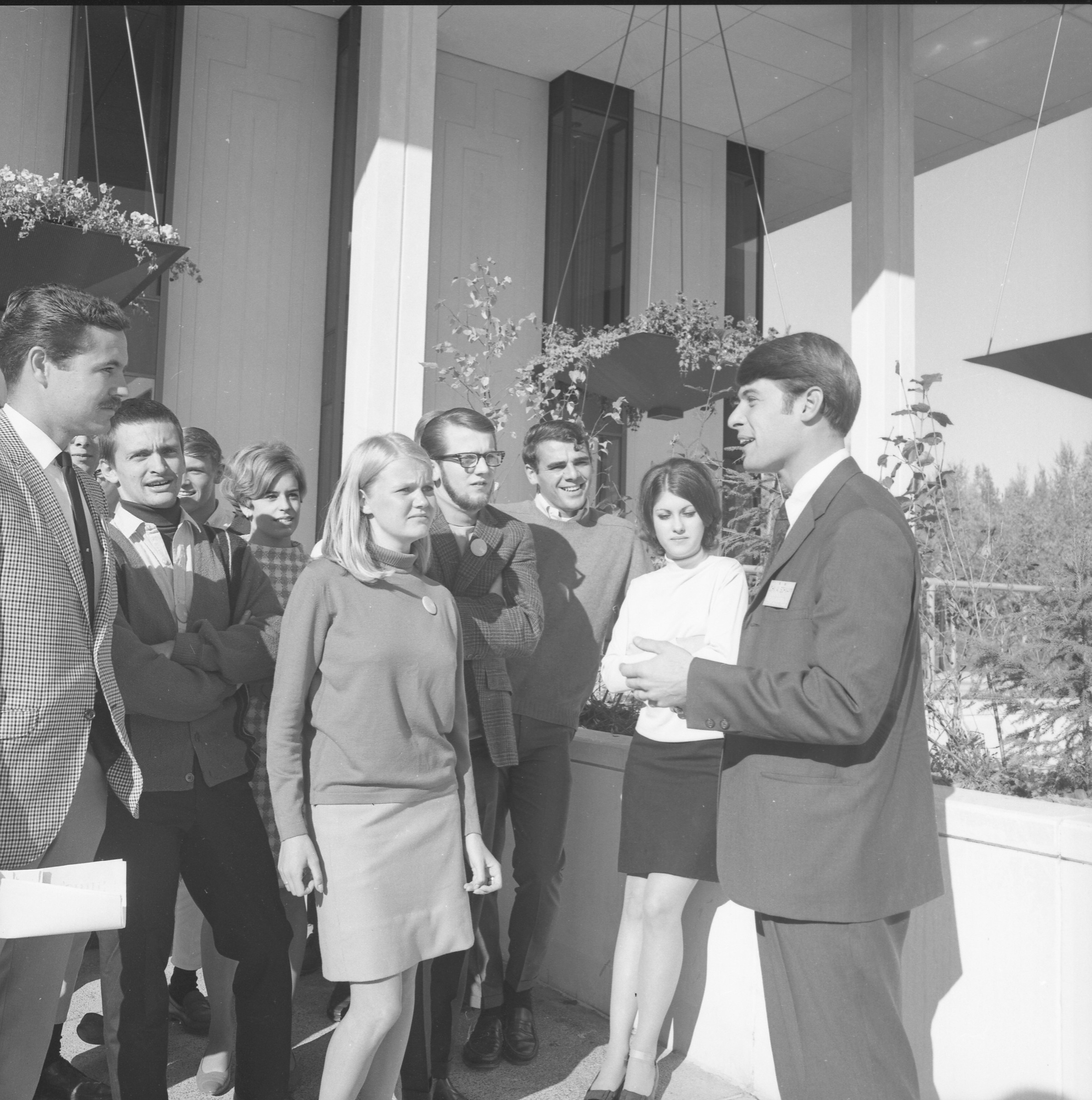 59-3; Interior of fish lab - dedication ceremonies; 7 sec med [Men wearing suits; one standing while others are seated in Ketchikan Fish Products Technology Laboratory; December 9, 1940]