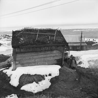 Kasigluk, 1949, Nochols family: rear: Marie K., Ella, Joe, and Evan. Front: Grace and Olive [men, women, children pose outside wood structure; kuspuk, mukluks, fur parkas, wooden barrels, wind]