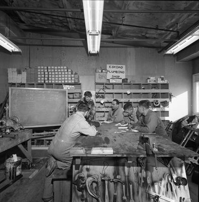 D-48. Repairing ivory sled runners. Hewitt's Photo Shop, Anchorage (Solomon, Alaska) [Alaska Native man in shop using tools]