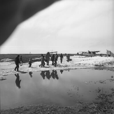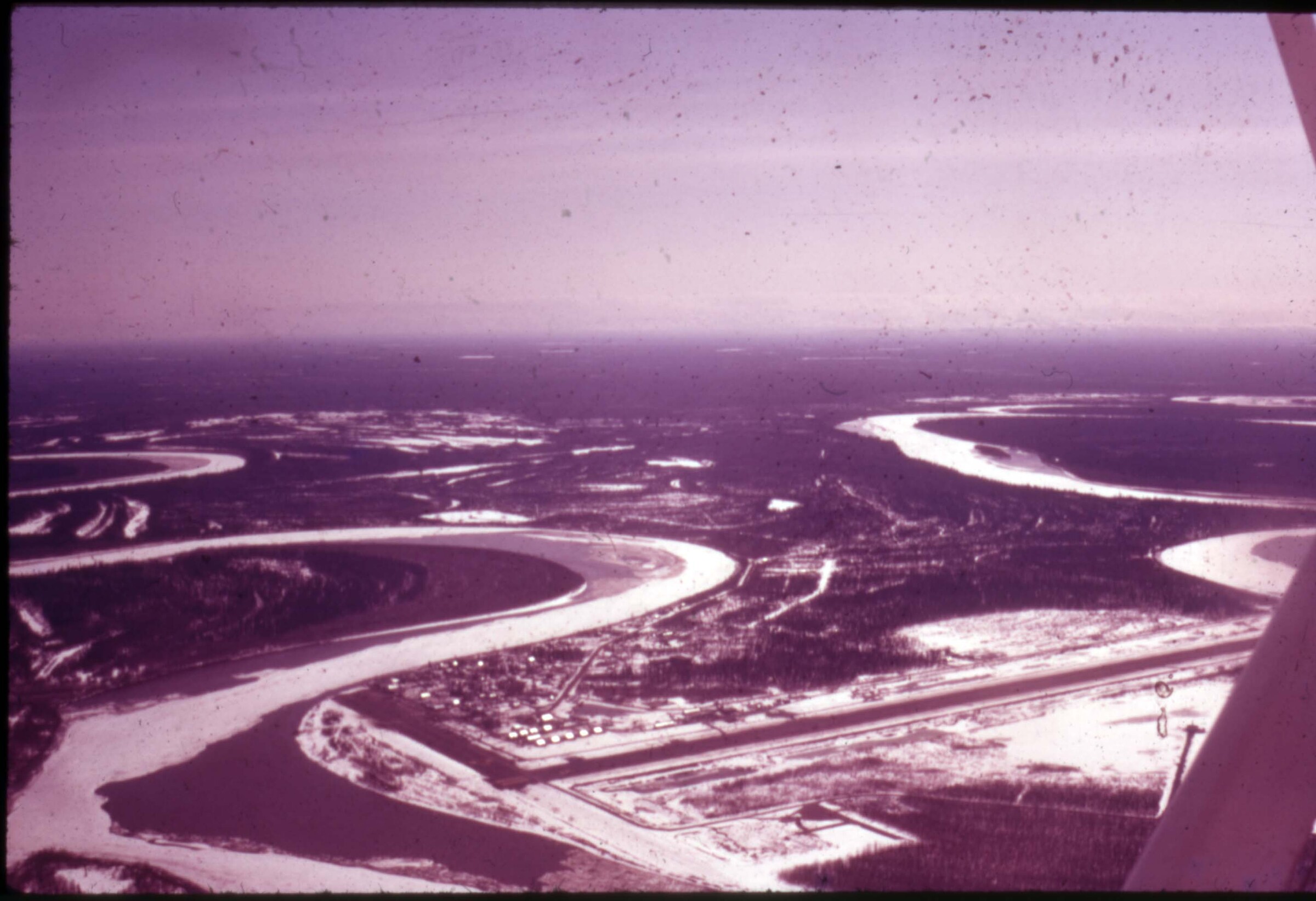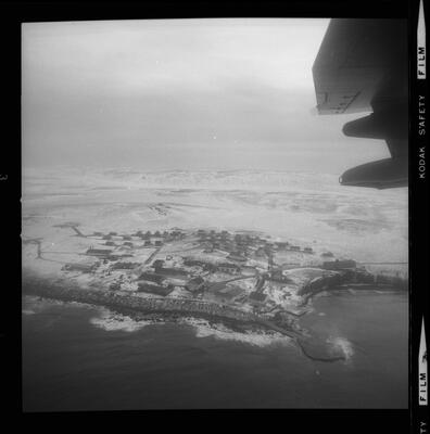 (NCL Trip: Village of Chevak, natives, plane, etc. 7 negs, along shore,-6 aerial view)[aerial view of coastal community]