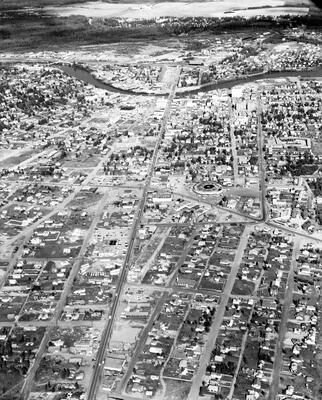 (T14 Fairbanks, Alaska, waterfront) [Pacific Alaska Airways Fairchild 71 NC 9709 floatplane and likely Stinson Reliant SR-5A, tail number NS-9 floatplane, modified in foreground, skiff on Chena River, people, businesses along river: Drugstore, Martin Pinska, Merchant’s Café, Hotel Northern, N.C.Co., gasoline pump, automobiles, tracked vehicle, trucks; bicycle power plant in background; copy neg; similar to .1591]