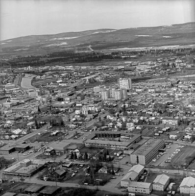 [Anchorage High School, oblique view of front with street, parked automobiles]