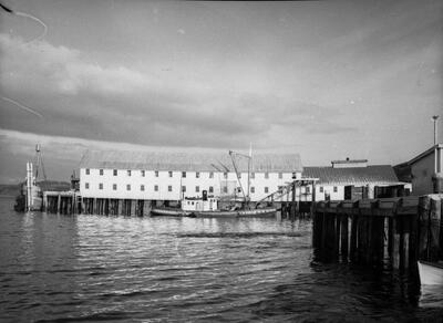Canneries. Bering Sea. [crew men preparing Diamond M boats at dock, with cannery building in background]