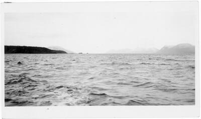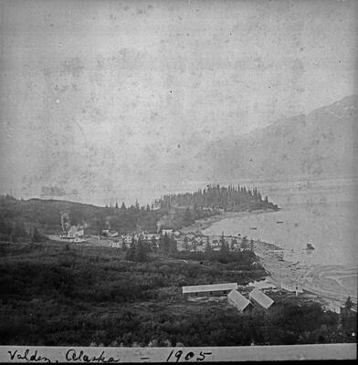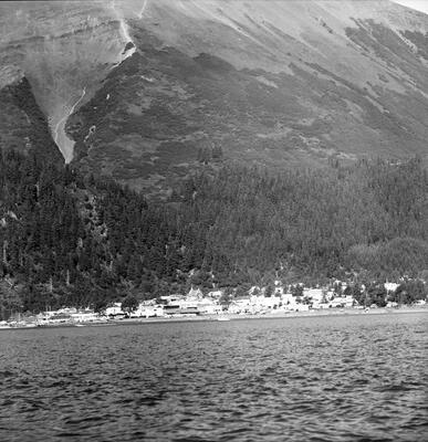 Alaska(Skagway)[view from mountain side looking down onto the docks where a large steamship is docked and is taking on or offloading passengers town center can be seen in the distance]