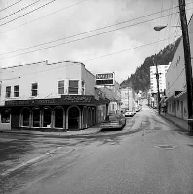 (Fourth of July Parade, Anchorage, 1935) [spectators watching automobiles with floats pass on Fourth Avenue near E Street, with banners hanging over road]
