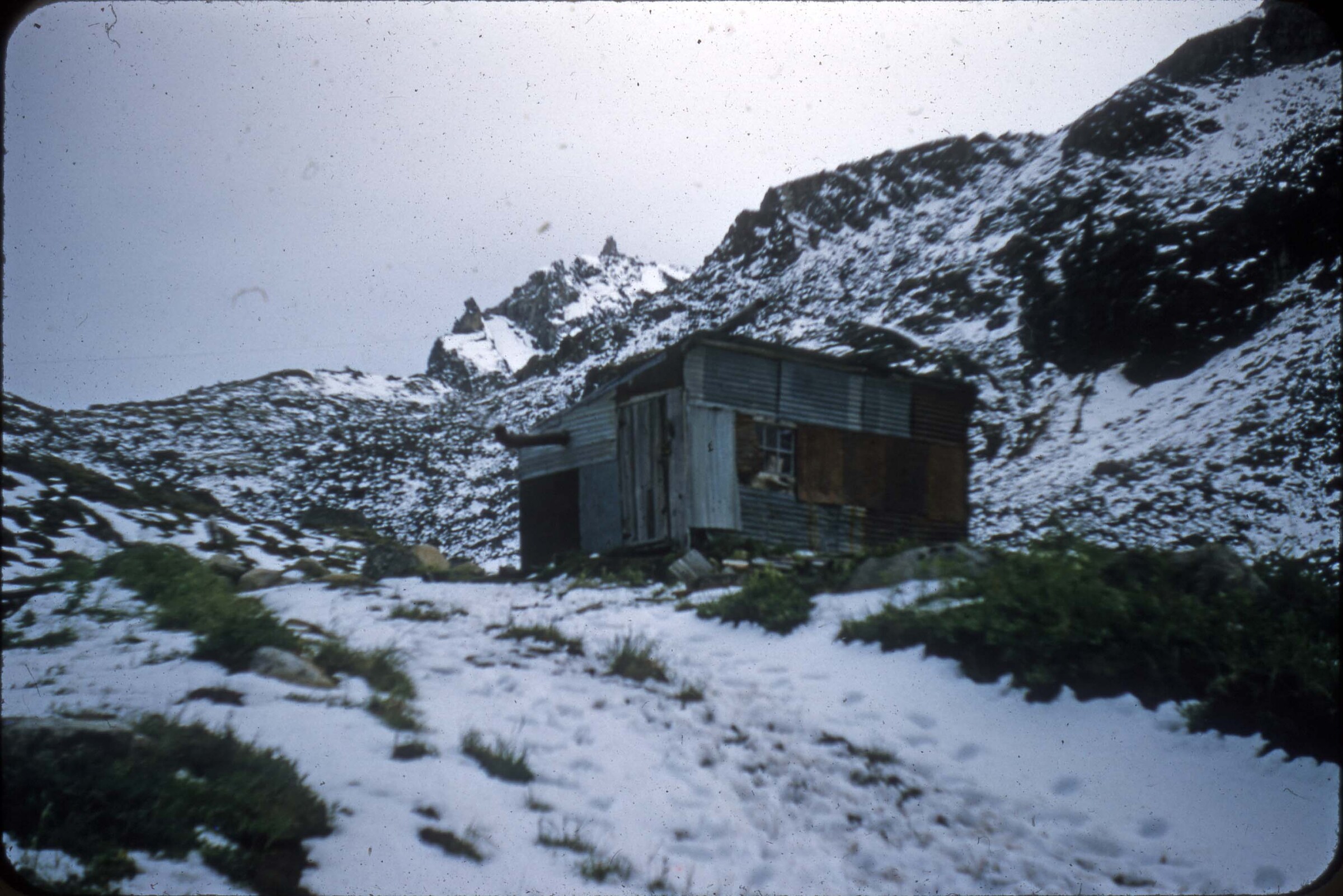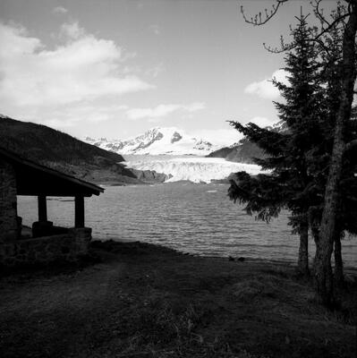 40-1 Feb 21 - March 1st Plus X 40-24 Dev 13 min in Dk20 @65° Boundary marker between U.S. & Canada; Hyder, Alaska [Obelisk marker; structures on pilings in midground; mountain in background]