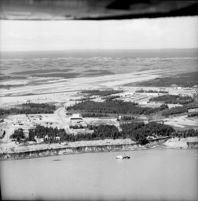 Cook's Inlet [bird's eye view of residential area in northwest Anchorage with Ship Creek, Anchorage docks, ship in Cook Inlet in distance; Sackett's Harbor at dock?]
