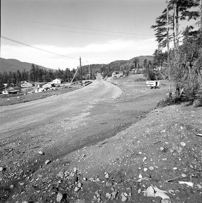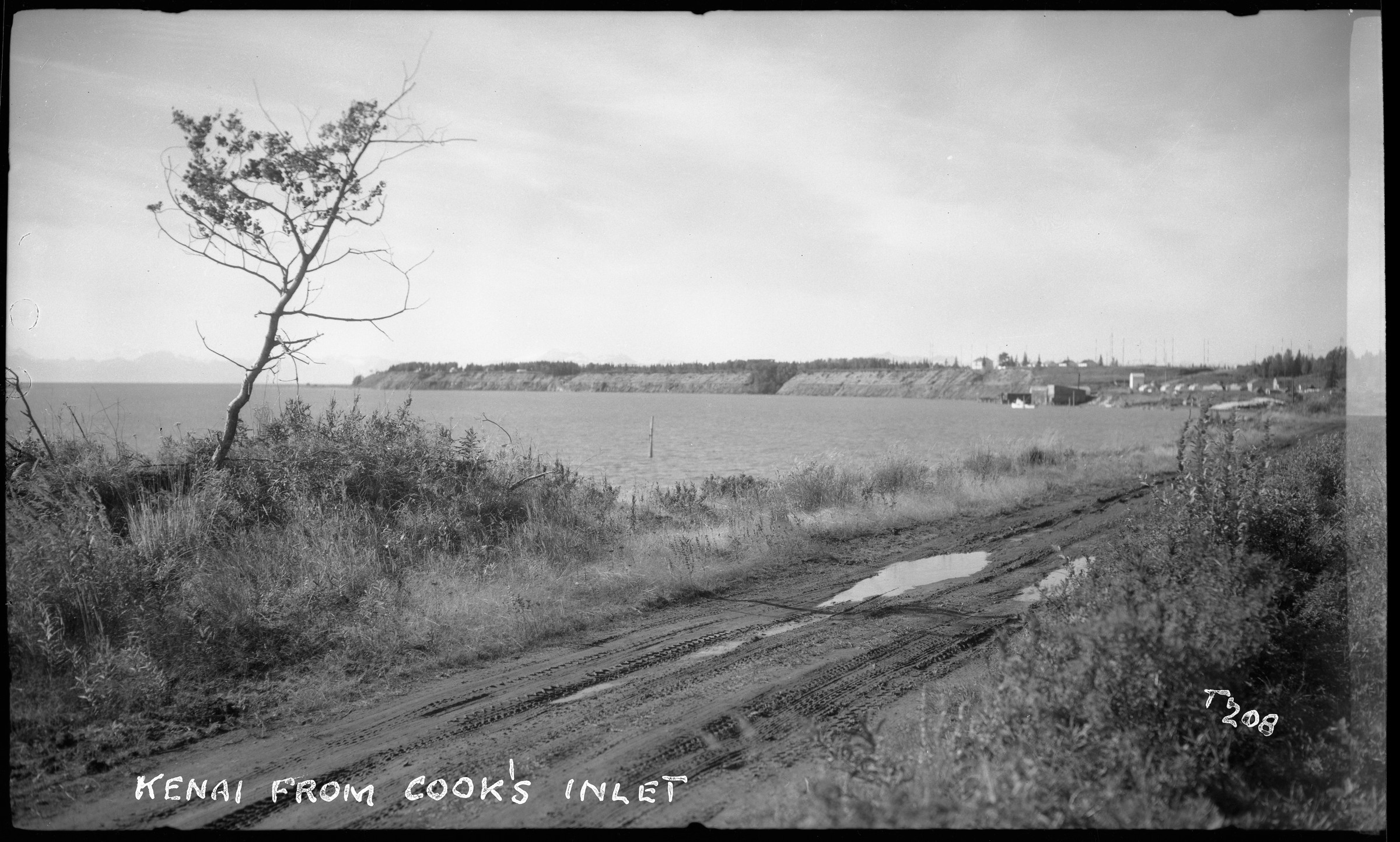 T208 Kenai from Cook's Inlet [muddy road; structures near shore in distance]