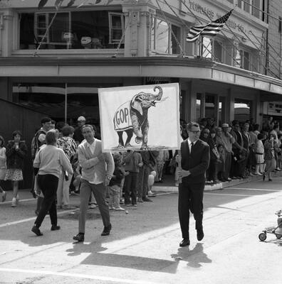 8-1940 (Fourth of July Parade, 1940) [Baby Shop float with stork pulling sled]