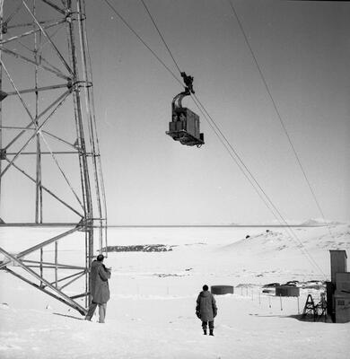 Keywords: Alaska, Alaskan, Men, Man, Bunny boots, Boots, Coat, Hats, Gloves, Clothing, Outerwear, Footwear, Winter, Snow, Outside, Power lines, Poles, Buildings, Structures