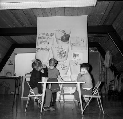 "Alaska Crippled Children Association, 1966 Easter Party; 2 boys and harmonicas" [Easter baskets and cards, Black boy and white boy play harmonicas; adults in background]
