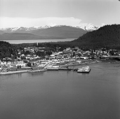 [bird’s eye view of coastal village, two large storage tanks at left; undated, 1950s]
