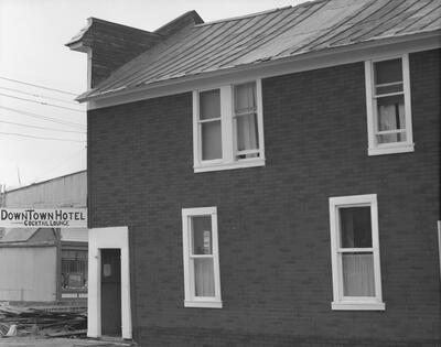 13-6 Ralph Marsh in hospital window; Tues, June 13 [rear view of Ketchikan hospital, harbor and Tongass Narrows in distance; wooden structures; picket fences; clothesline at lower left; likely 1939]