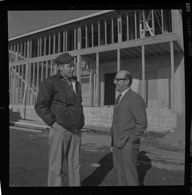 (Building Federal Building, P.O. Annex, Apr.24, 1941) [view of construction site of new federal building on Fourth Avenue in Anchorage, walls going up for postal annex, showing scaffolding and sign reading: This project being constructed under the control of the Federal Works Agency Public Buildings Administration]