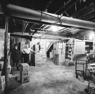A number of concrete block bldgs of Anchorage to demonstrate that generally those buildings did not suffer serious damage in the March 27 earthquake of 1964. The views were made for Ken Sheppard President of the Alaska Concrete Products corp on Whitney Rd. This image is of the First Federal Savings and Loan Spenard Branch.