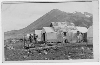 (Cronin #17 ARC freight and ticket office at North Nenana EJ and Adeline Cronin 1920){depot ticket office with two men stading infront of tent}