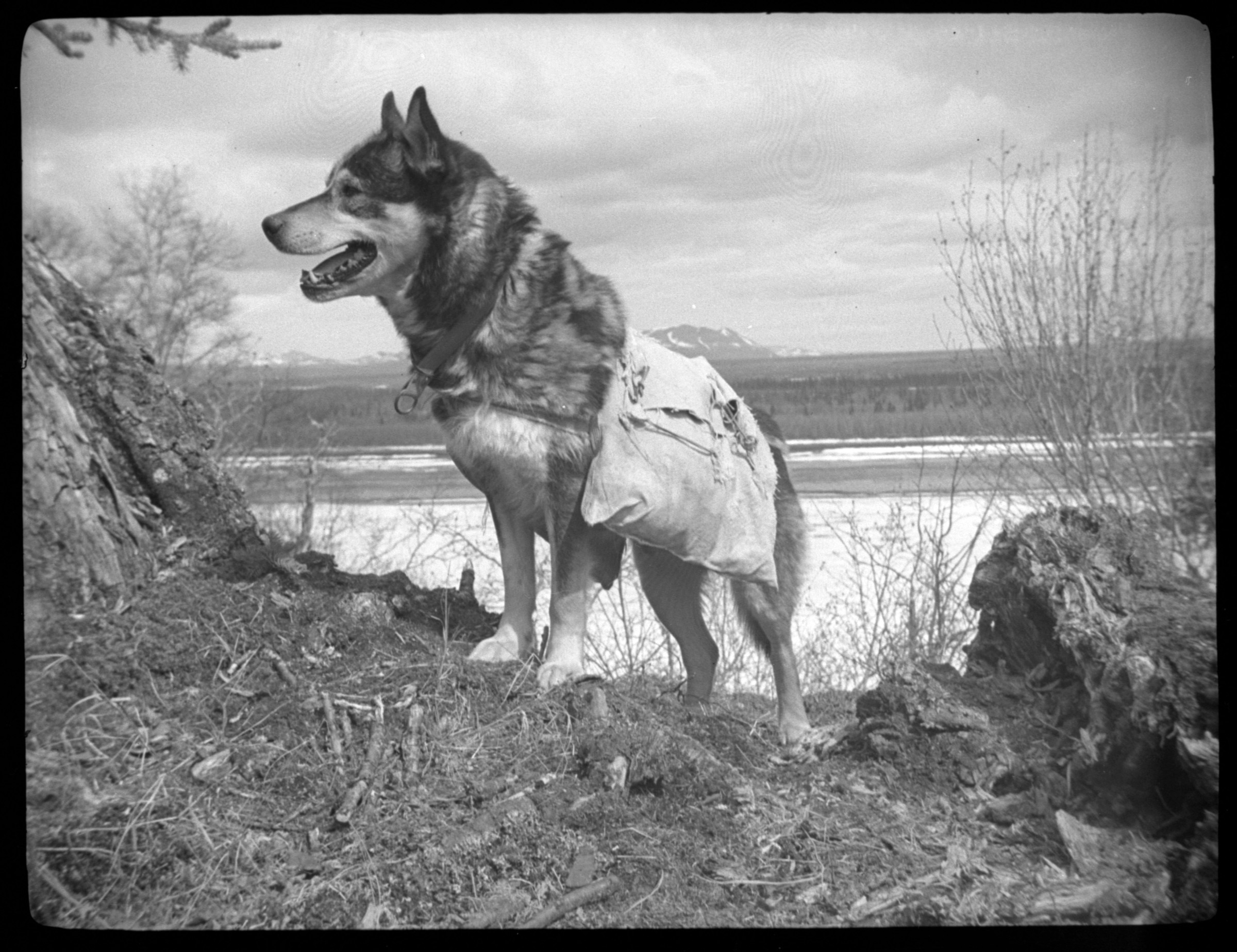 [portrait of dog wearing pack, river in background, possibly Yukon River]