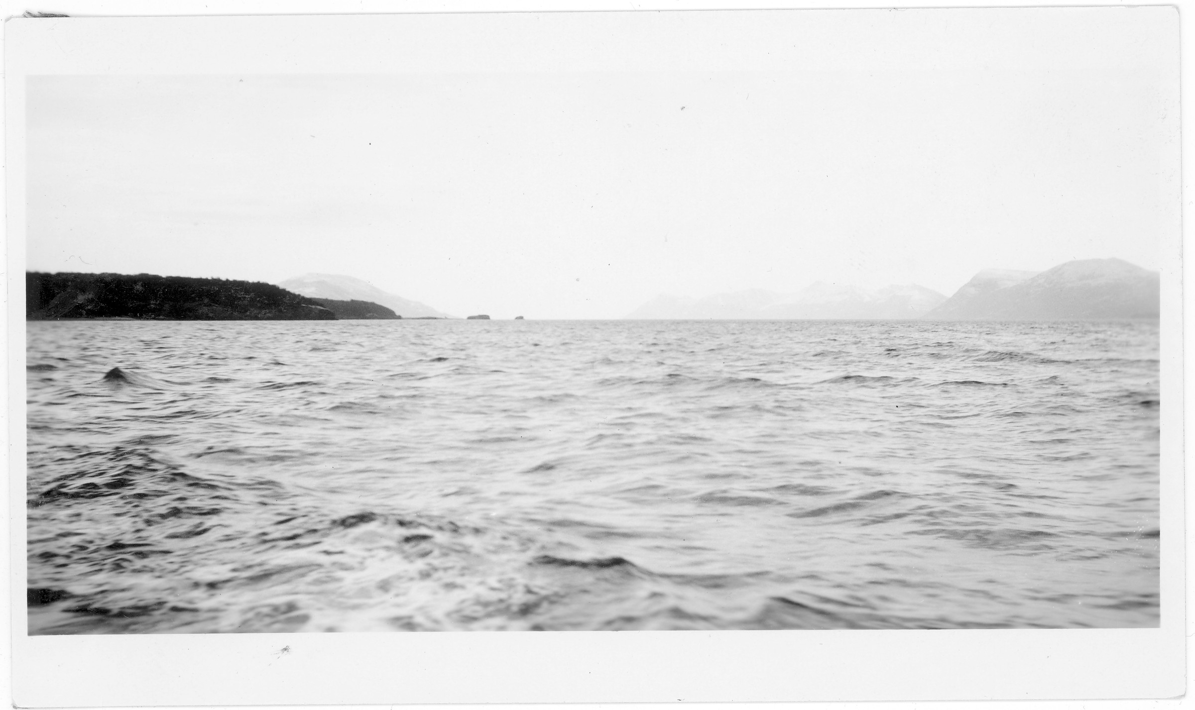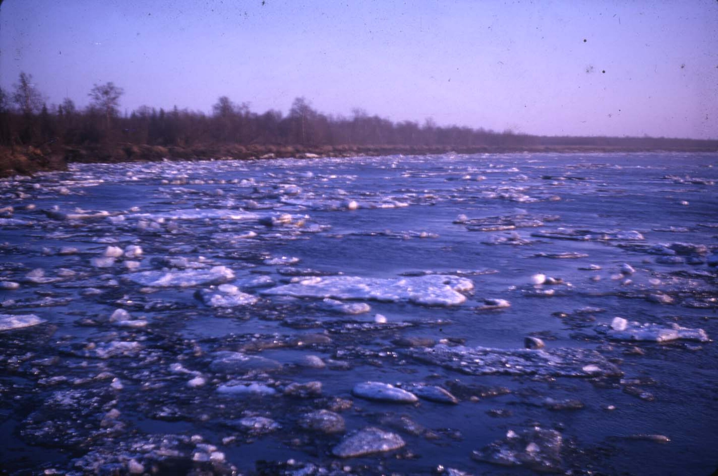 [view down waterfront in winter, with village buildings at right; no date]