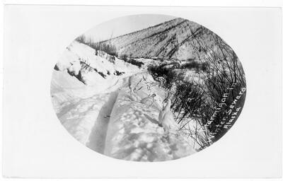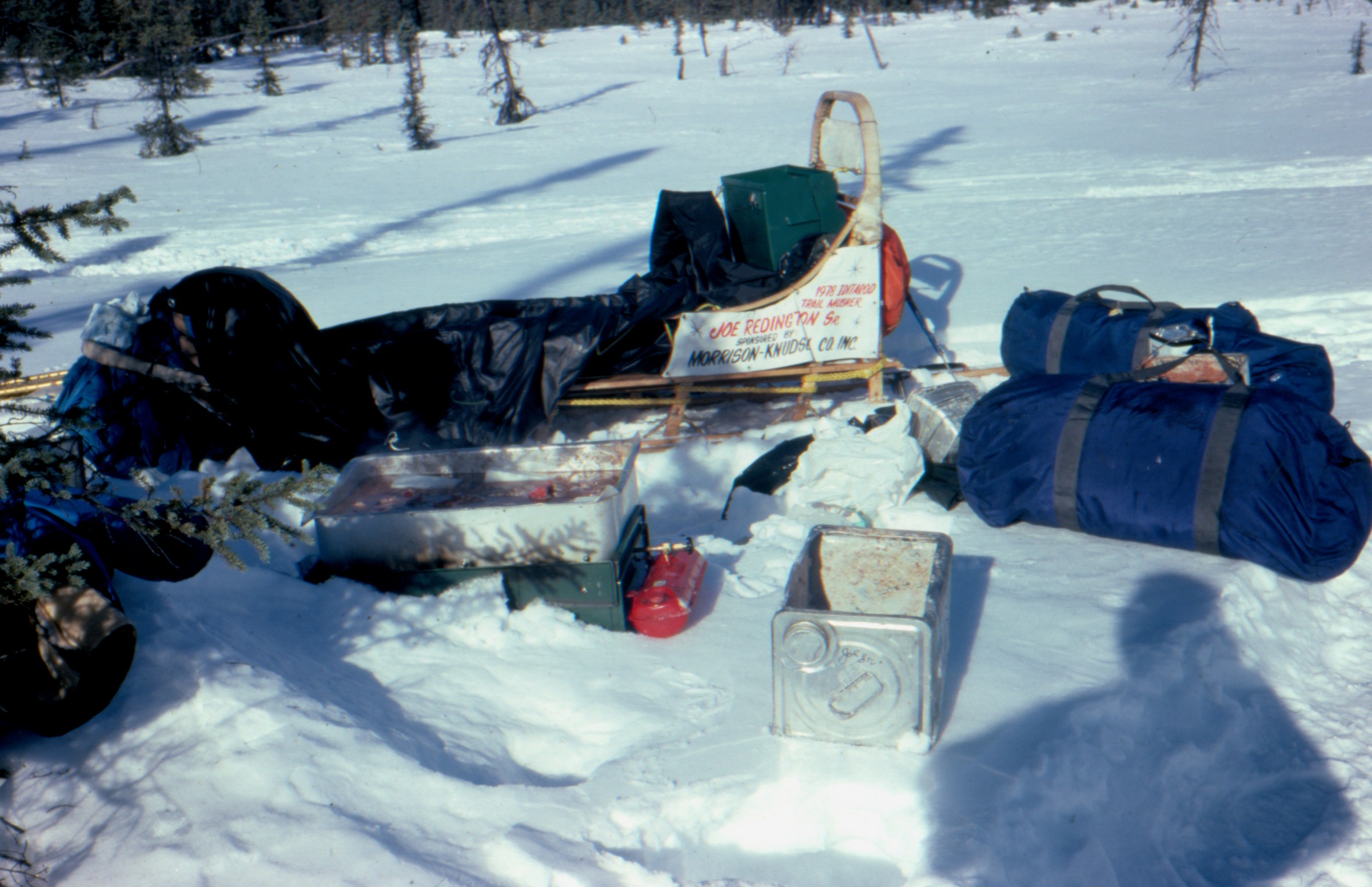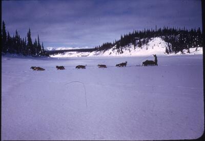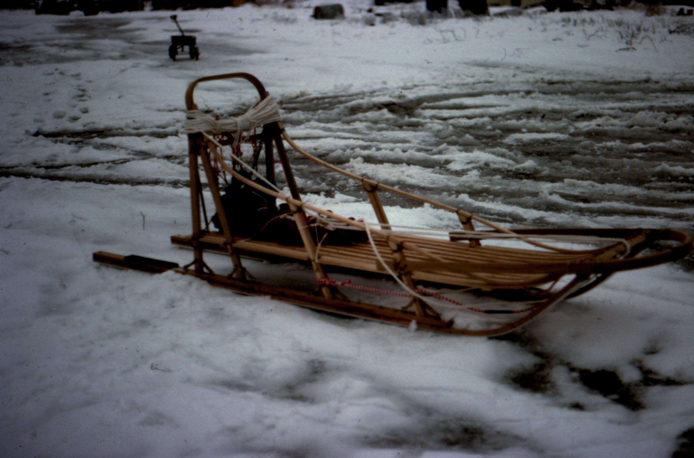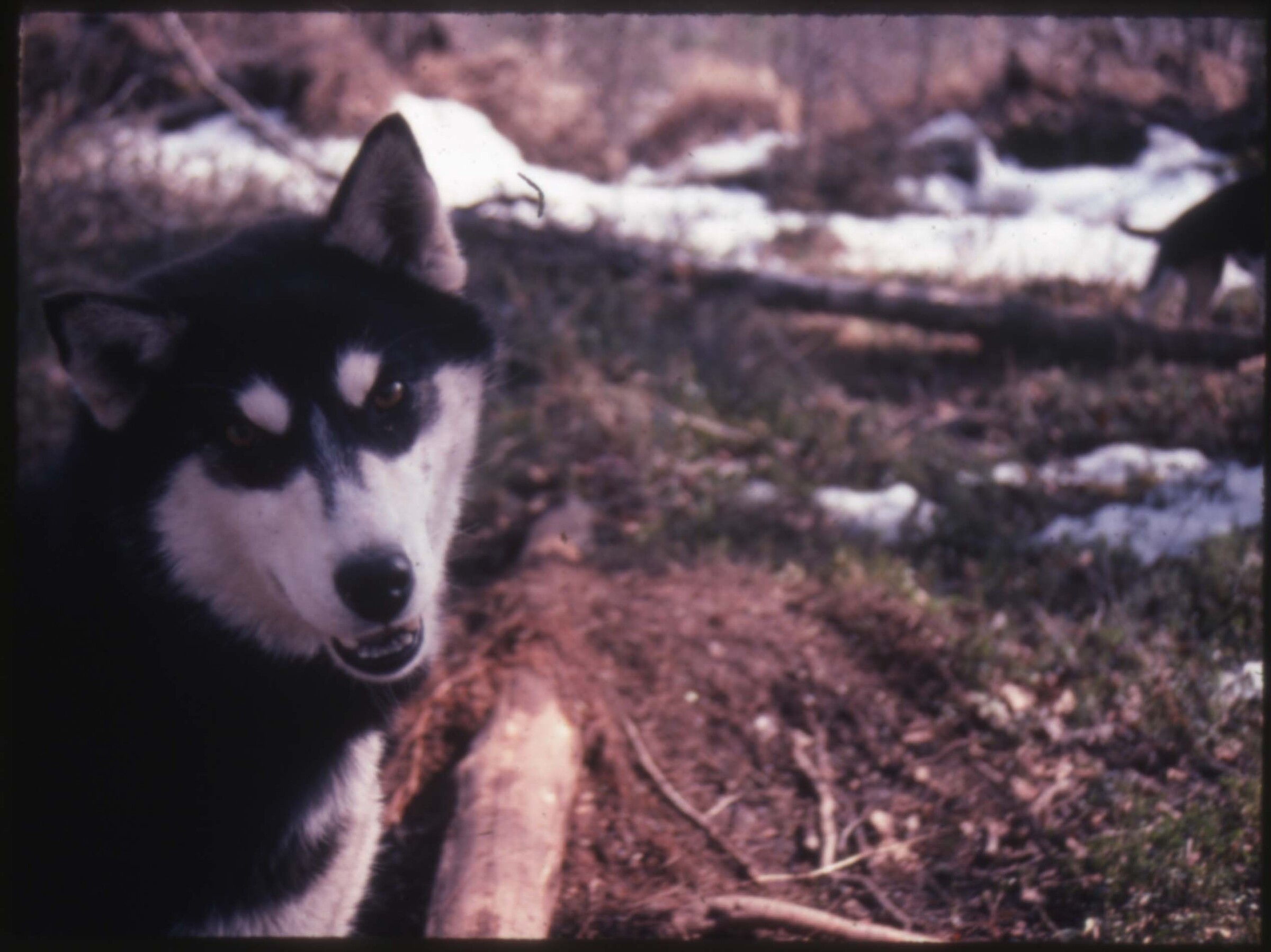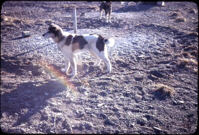 5/27/46 [winter scenic with dog and ski poles in snow in foreground]