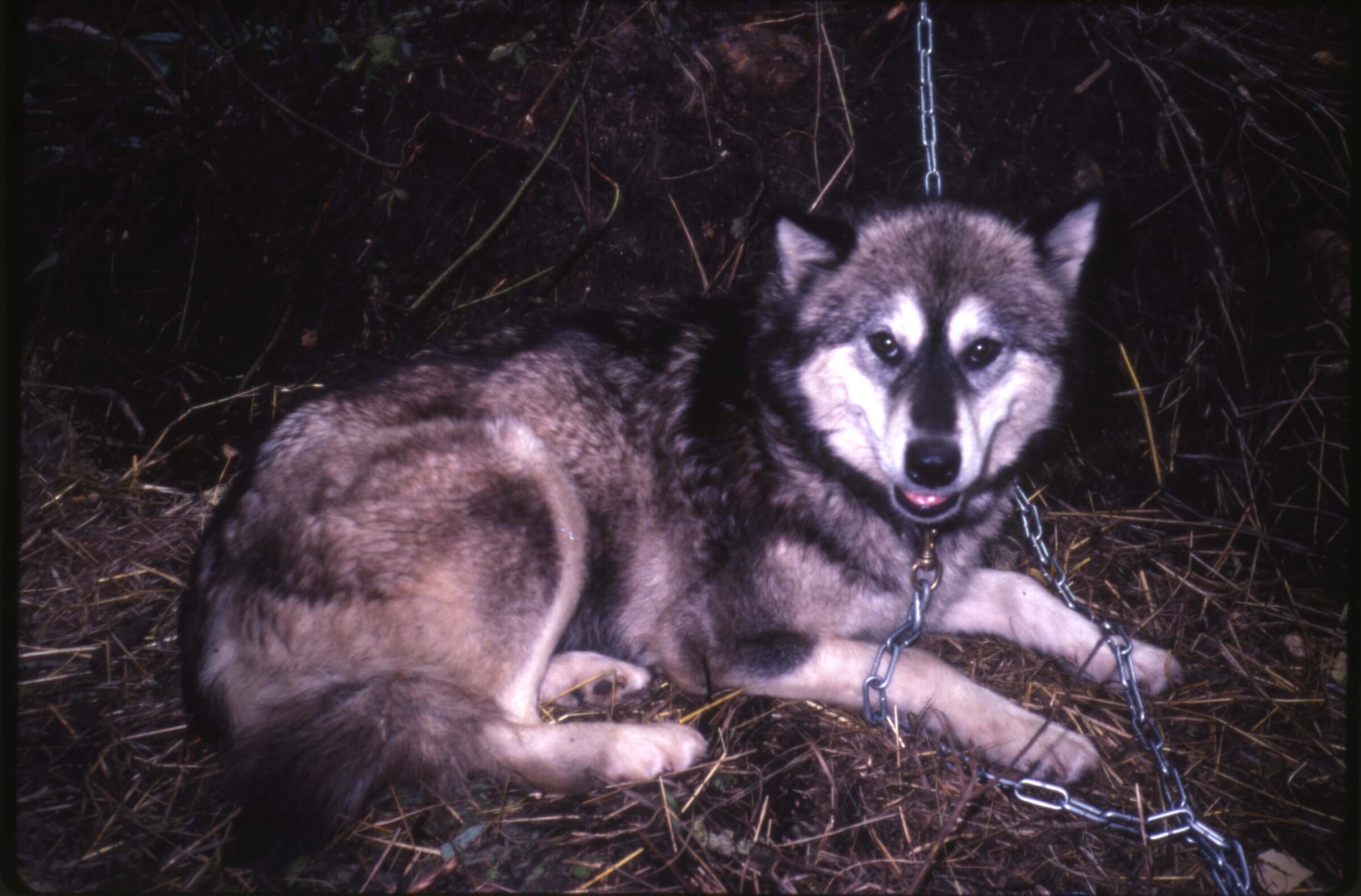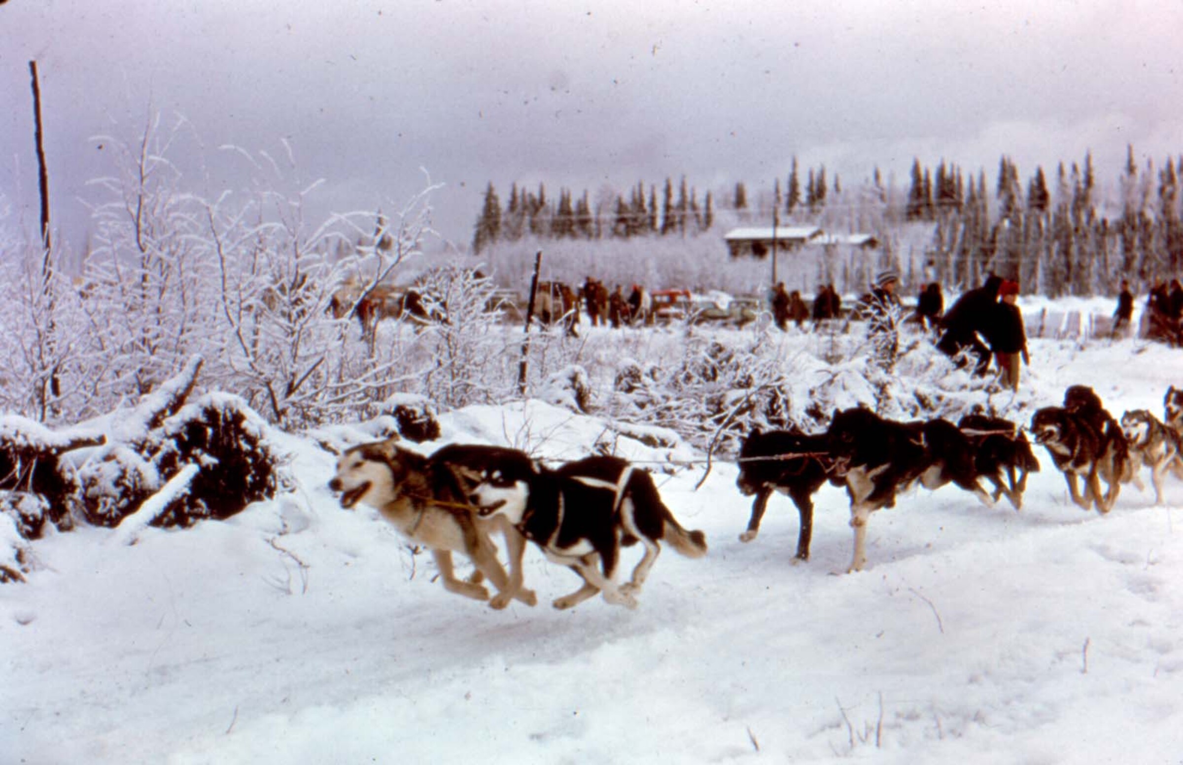 The Last Mail to Leave Anchorage by dog team March 28, 1917 Buildings are left to right: Post Office, City Bldg., Marshal's Office & Jail. This is 4th Avenue between F and G Street on the side where the Federal Building now stands. (1963)