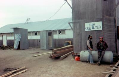 [structure made of whalebones and driftwood, snowmachine and sled on tundra in background, people and structures in distance, Point Hope; print date Jun 72]