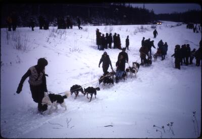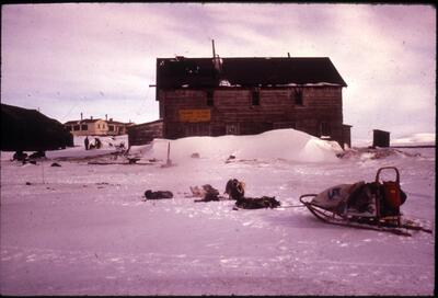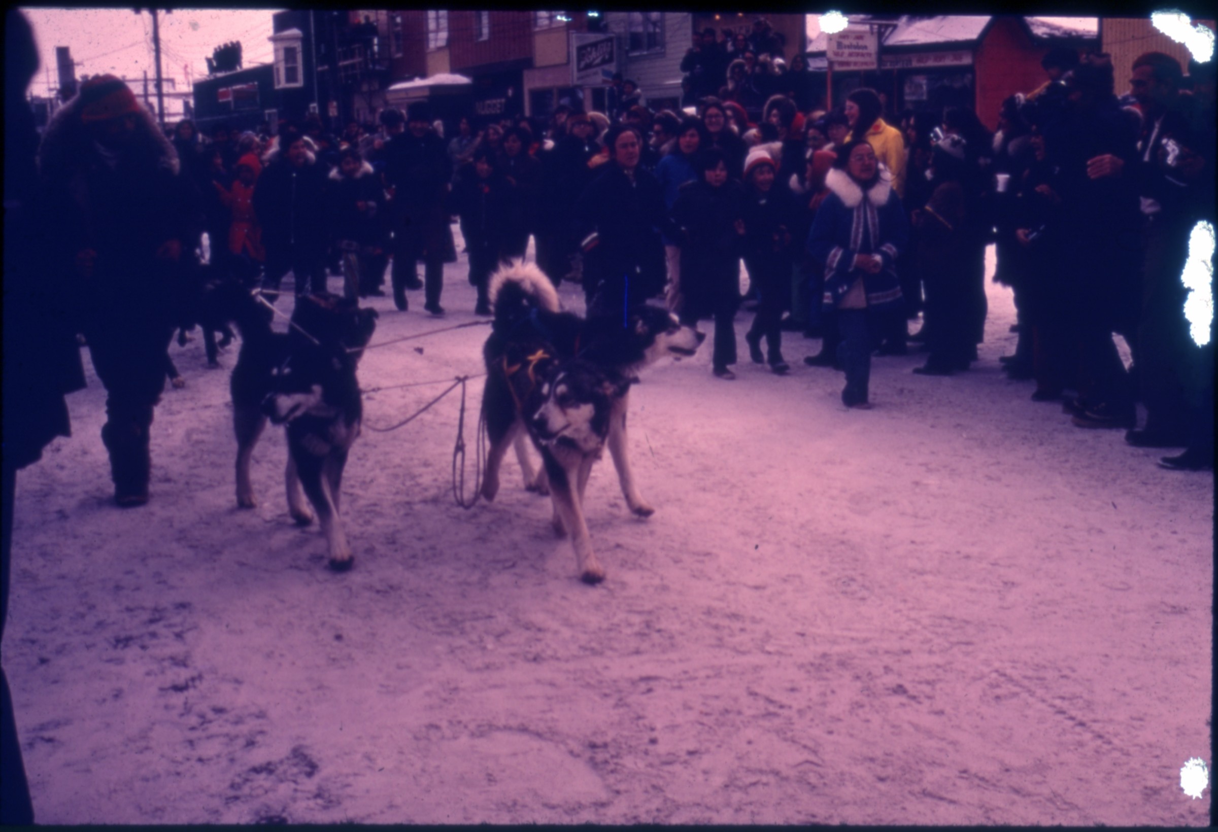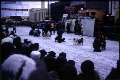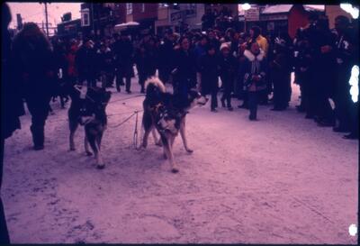 [Dog team in front of building with sign Solomon - El Paso, Alaska]