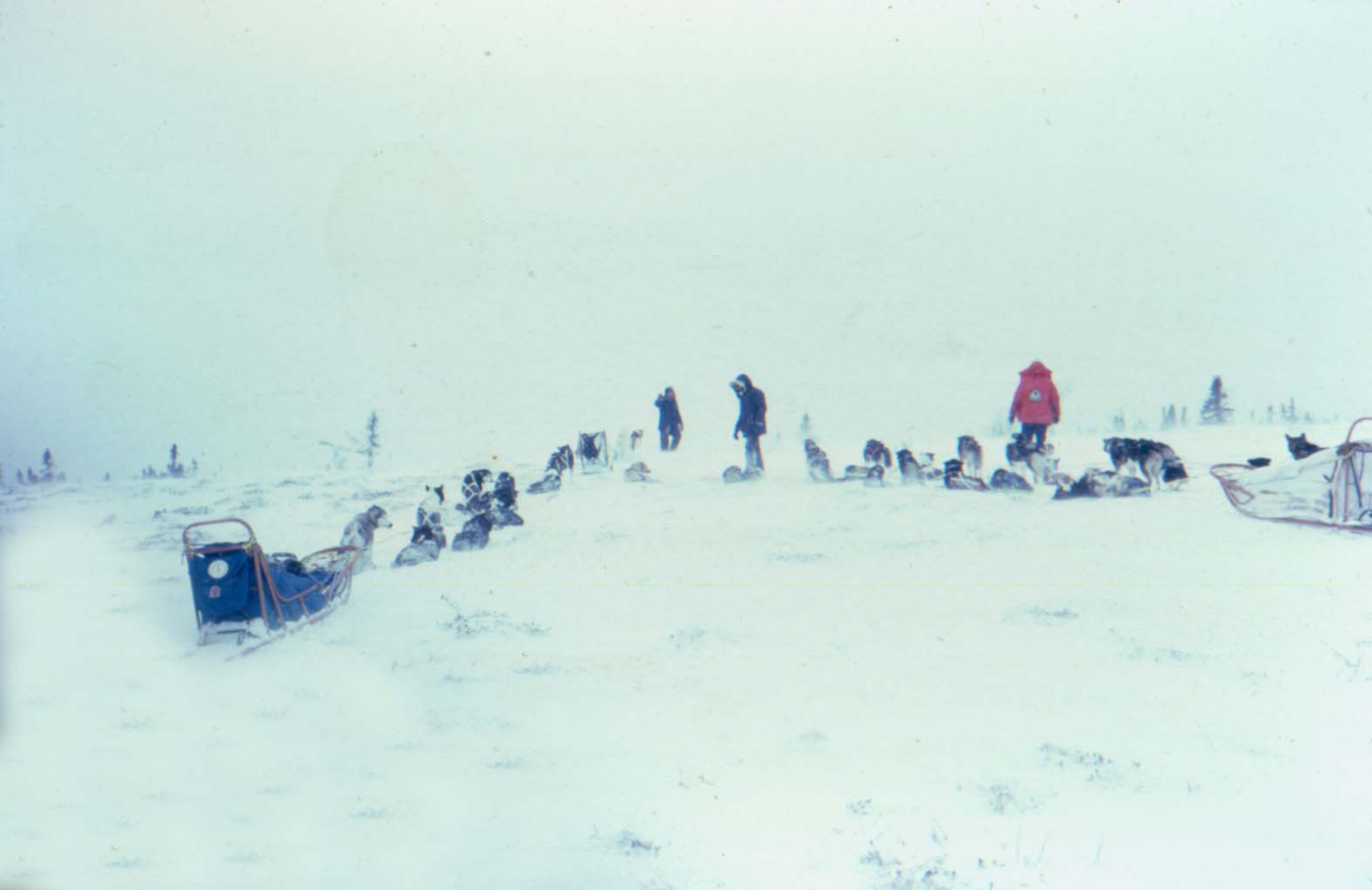 [two surveyors at work above military installation buried in snow in winter, mountains in distance, Adak]