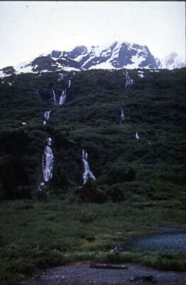 L140 Seward - Anchorage Hiway (highway) [paved roadway with center striping, automobiles, elevated roadbed, wetland, bog or creek, trees]