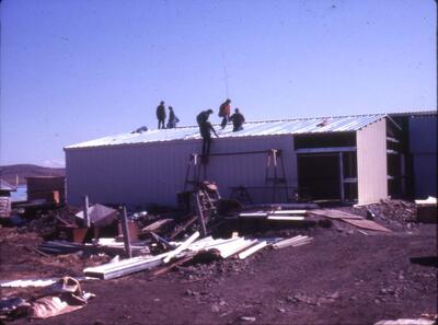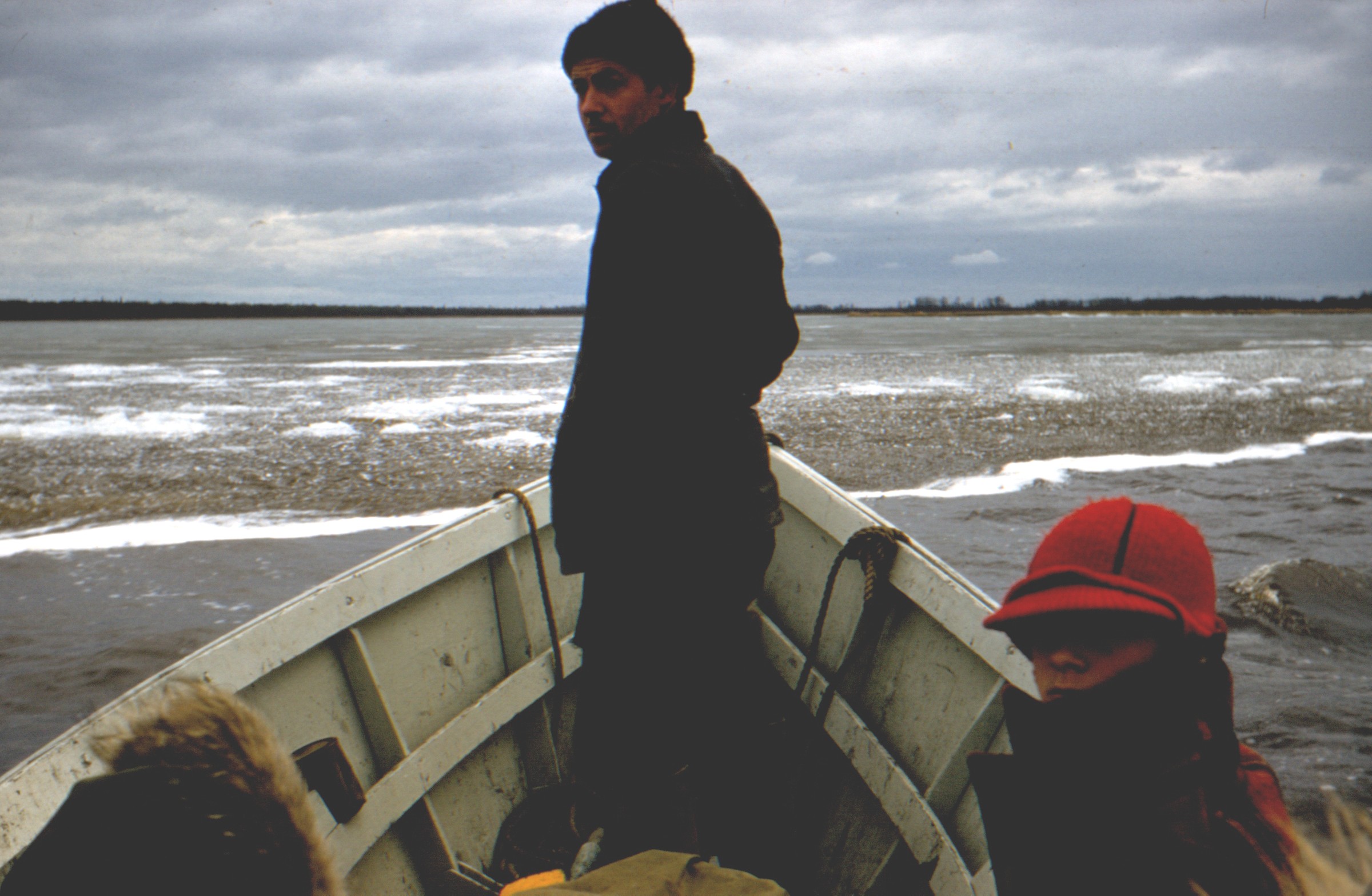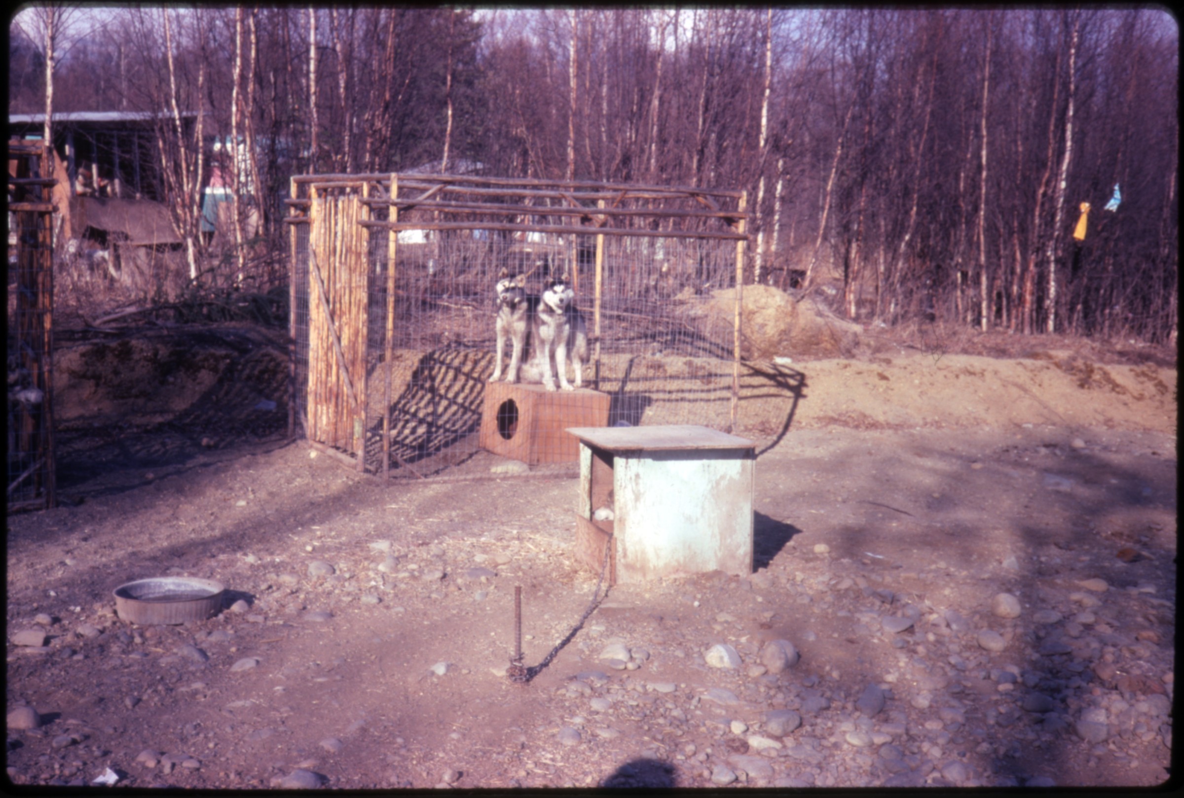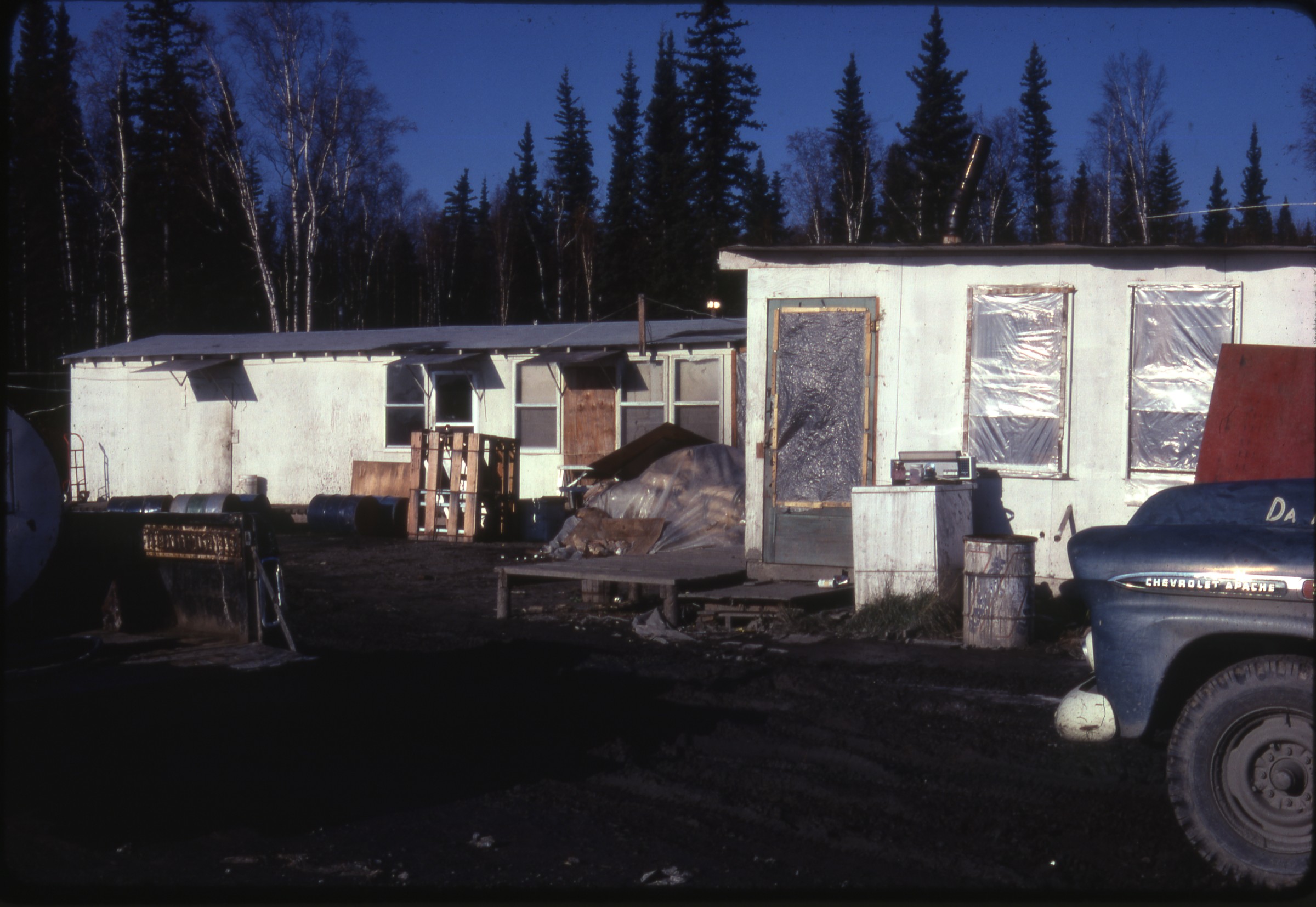 Bleaching moose hide, Allakaket, AK, 3-81 [moose hide on snow, surrounding cabins and equipment]