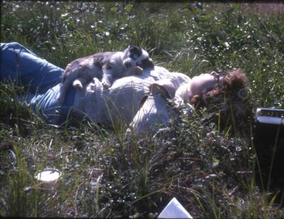 [unidentified man and woman sitting in field of shooting stars wildflowers, 1940s. has neg]