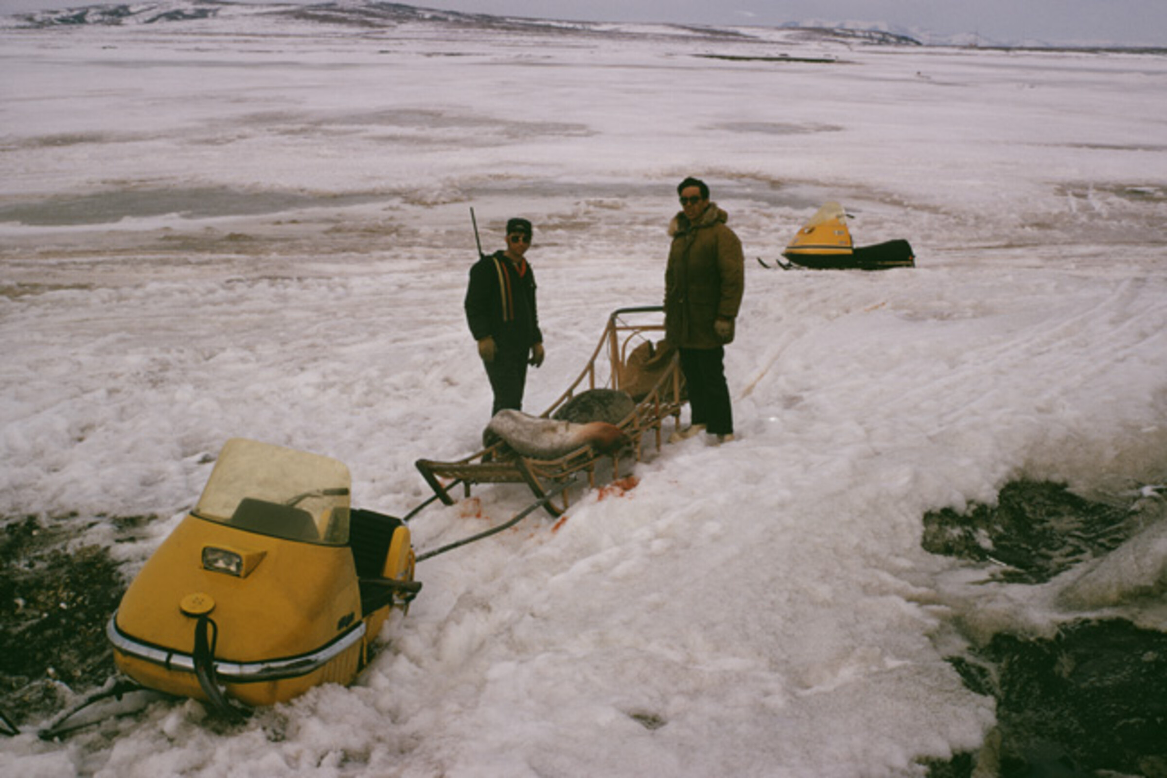 [woman sitting on bucket, ice fishing, tom cod on ice, two people standing at right; print date Sep 71]