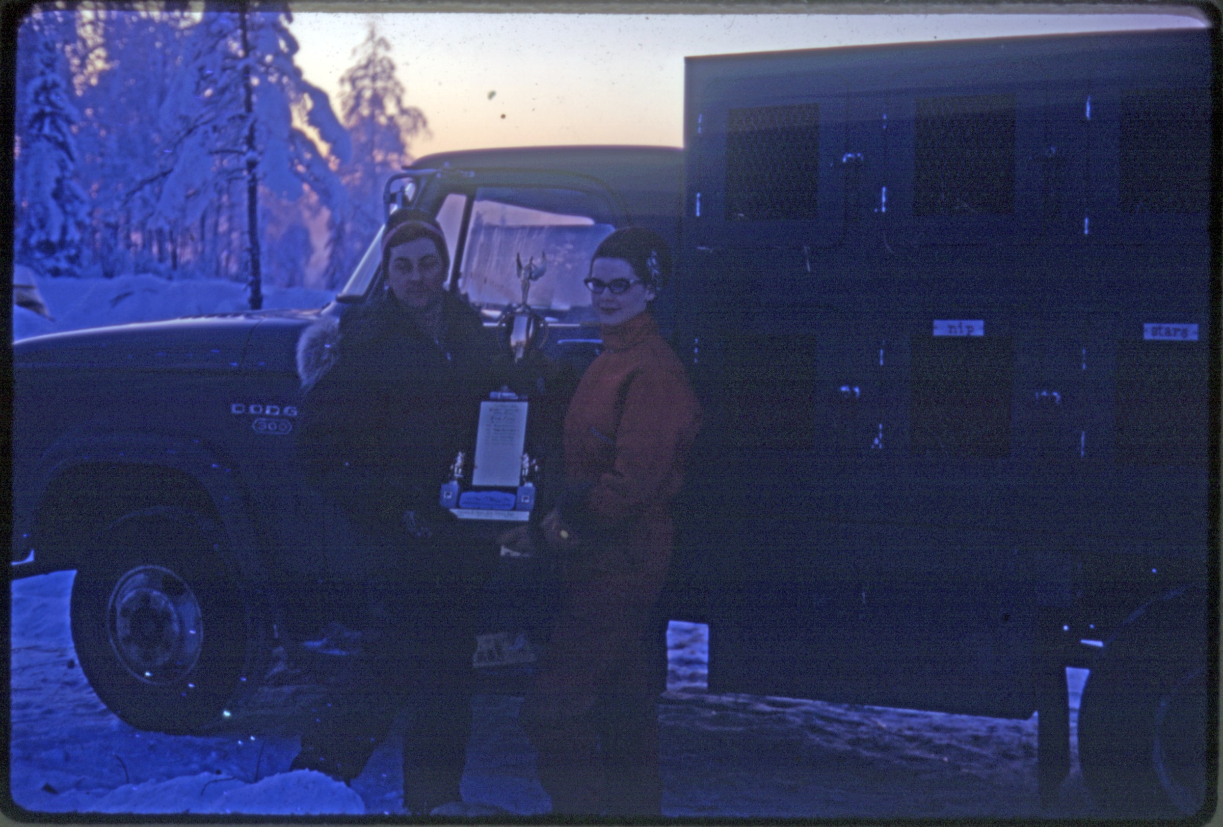 Carl Fritzler, Nulato. [Volunteers holding signs, "Iditarod Checkpoint" and "Big River" with "Finger Lake" crossed out.]