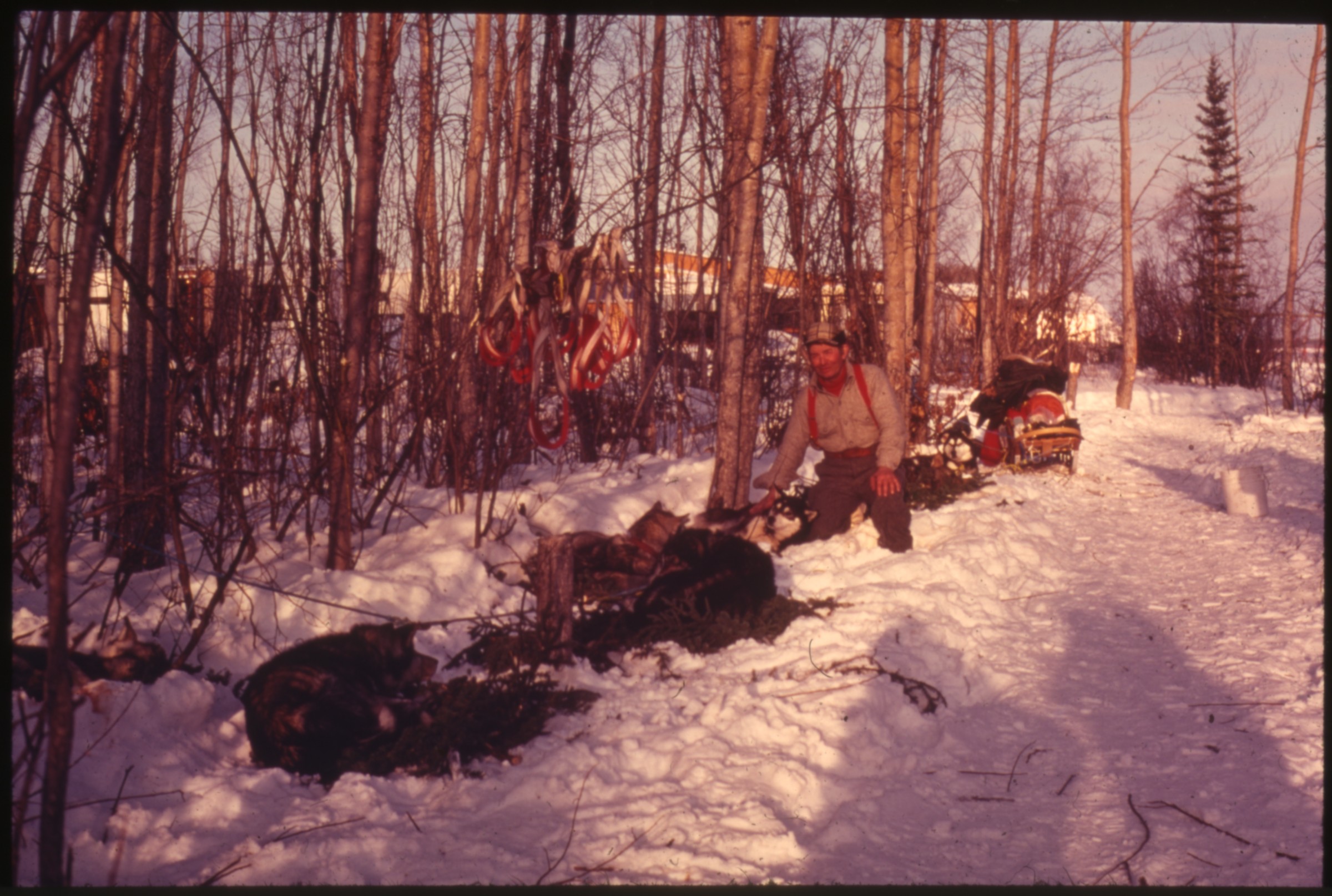 [dog team and men in the snow standing by and on boardwalk]