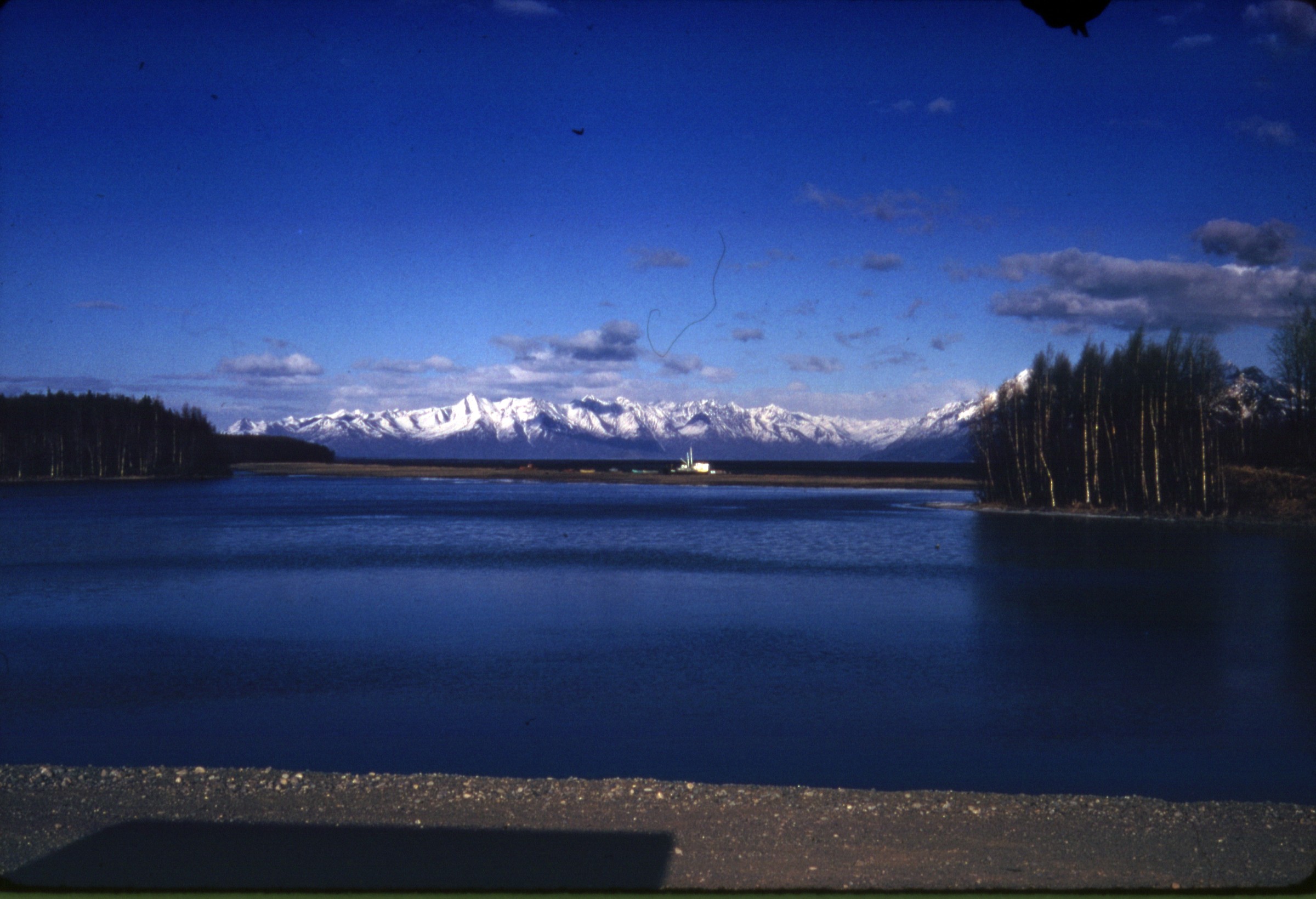 L25 Enroute to McKinley National Park "1946 postcard" [scenic view, lake or river, mountains, spurce, clouds, copy neg]