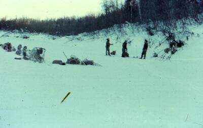 Winter fishing [Russian Mission]. Fish traps were put out just before Christmas. They celebrated Russian Christmas which is on January 7th. [men setting up traps on ice, man in foreground holding scoop, hills in background]