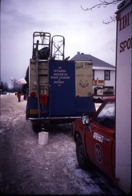 "4th of July 1947" [parade, float, spectators, Rutherford's Mens wear, boy on bicycle, boy pulled in wagon "Over the Alcan or bust!"]