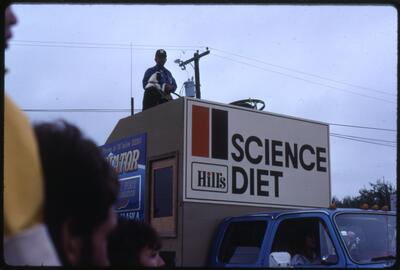 People-Parades-Anchorage 7/47; 4th of July 47; 10 of 18 [Red Cross float in field, nurses, man dressed as soldier in wheelchair, blanket, doll, tractor, spectators]