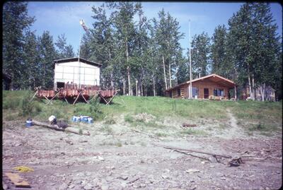 [man dipnetting from river bank, canoe and small boat with tarp covering at right, bow of second boat in foreground, possibly Yukon River?]