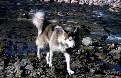 T121 Cape Wales, farthest west point in th American continent; Frank Morgan photo [view of coastal village; beach, rocks, water, structures, steel drums (containers) dogs; copy neg]